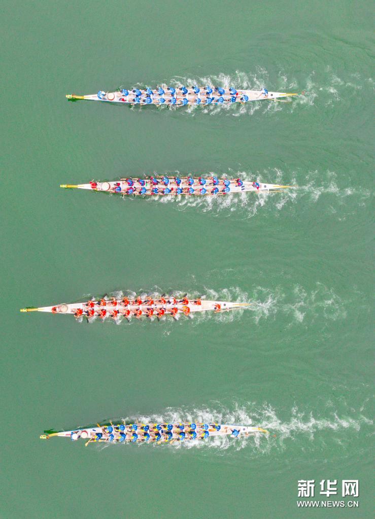6月14日,参与竞渡的龙舟在比赛中(无人机照片)。新华社发(聂爽 摄)