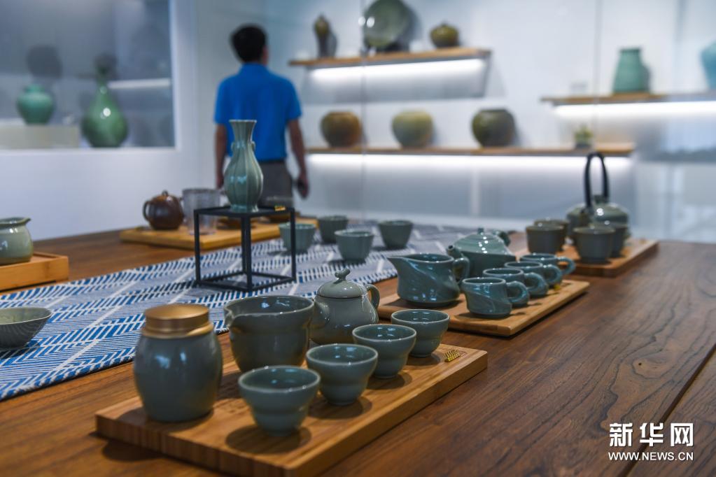 6月17日在慈溪市匡堰镇一家越窑青瓷企业展厅内拍摄的各类青瓷产品。新华社记者 徐昱 摄