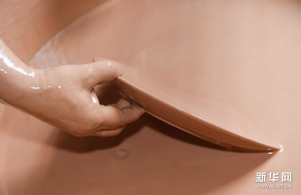6月17日,中国陶瓷艺术大师孙迈华在车间内给一件陶制品上釉。新华社记者 徐昱 摄