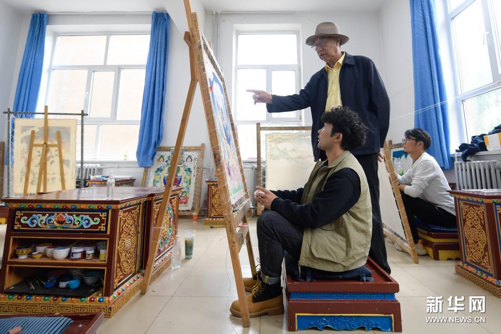 6月17日,在青海民族大学艺术学院,老师夏吾才让(中)在指导工艺美术(唐卡)专业学生绘制唐卡。新华社记者 张龙 摄