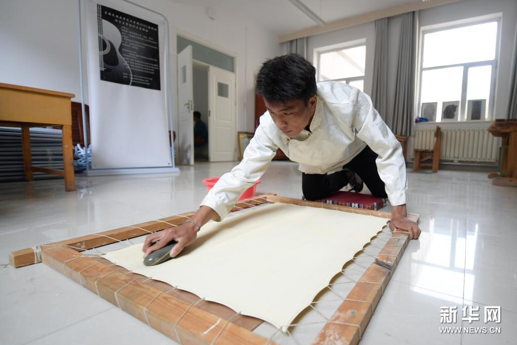 6月17日,在青海民族大学艺术学院,工艺美术(唐卡)专业学生在制作唐卡画布。新华社记者 张龙 摄