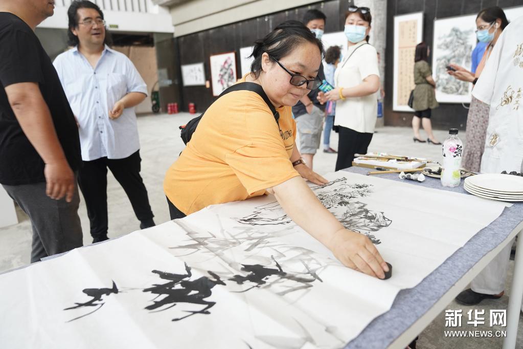 6月22日,在北京798艺术区,残疾人陈桂芝在“爱的阳光”仁美流动美术馆百场活动启动仪式现场作画。新华社记者 才扬 摄