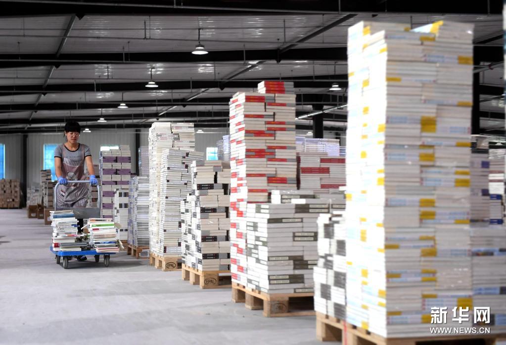 7月2日,在永清县三圣口乡一家图书文化企业仓储中心,工作人员在运送图书。新华社记者 王晓 摄