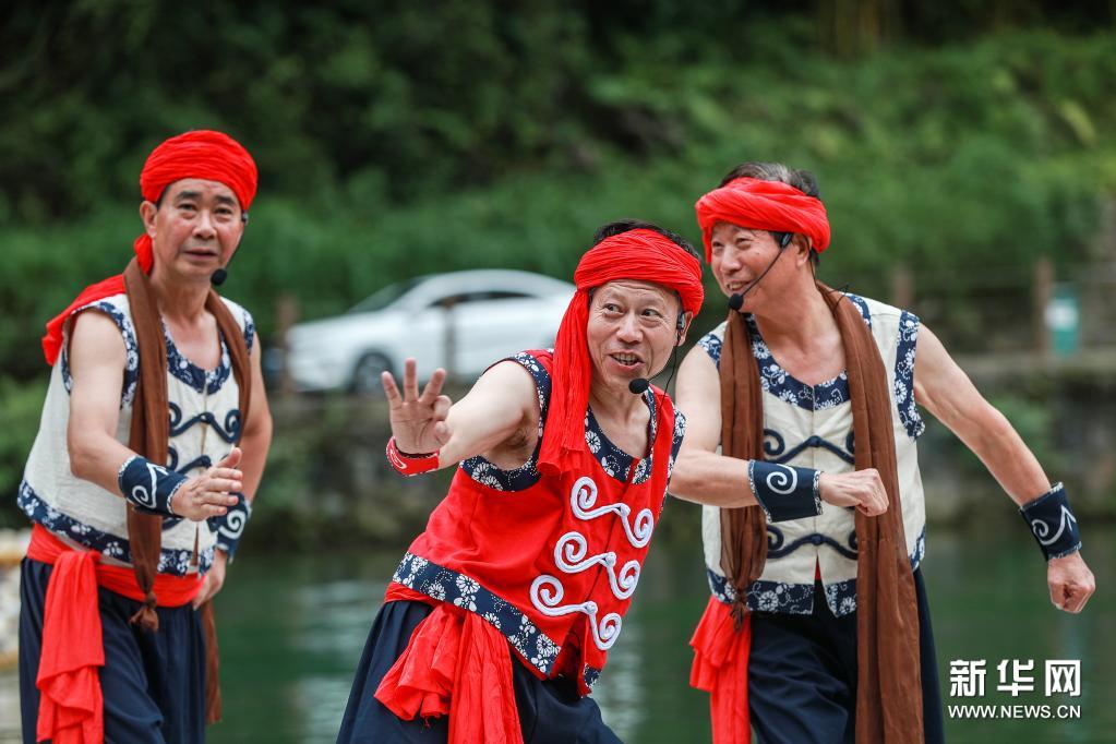 7月4日,民间艺人在秭归县三峡竹海生态风景区为游客表演国家级非遗项目“长江峡江号子”。新华社发(王罡 摄)