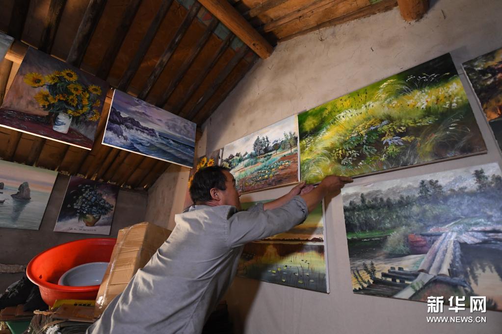 7月6日,位光明在位于斗门街道东堰村的出租屋内悬挂画作。新华社记者 翁忻旸 摄