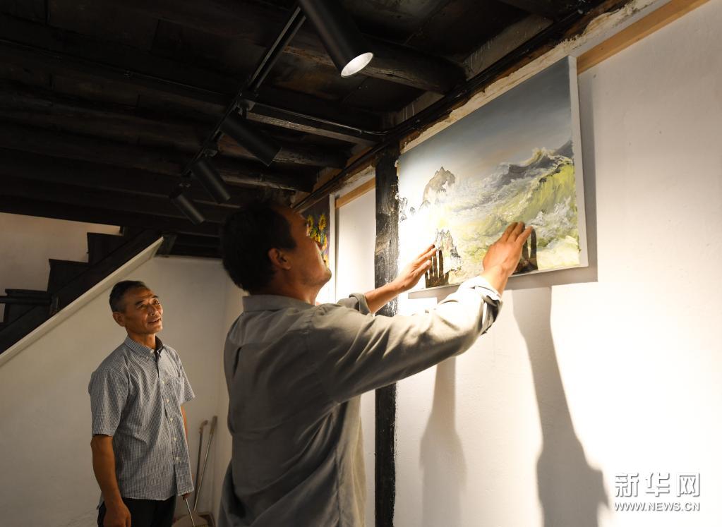 7月6日,位光明(右)在斗门老街上政府免费提供给他的新工作室悬挂作品。新华社记者 翁忻旸 摄