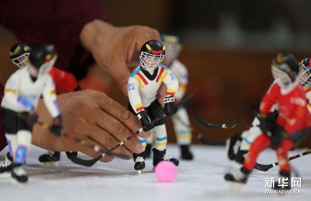 7月6日,山东省临沂市的民间艺人左安胜在展示他的面塑作品。近日,山东省临沂市沂南县红石寨非物质文化遗产博物馆的面塑艺人历时近两个月创作完成二十余件冰雪运动主题面塑作品,表达对北京冬奥会的期盼和祝福。新华社发(王彦冰 摄)