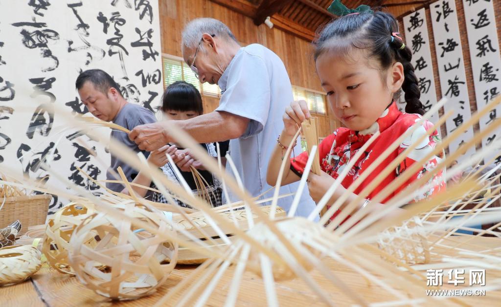 7月6日,在浙江省湖州市德清县莫干山镇庙前村农家书屋,孩子们在老艺人的指导下体验非遗竹编技艺。新华社发(谢尚国 摄)