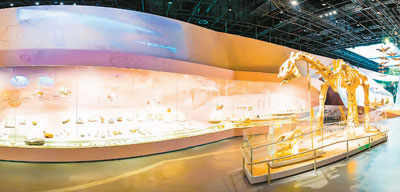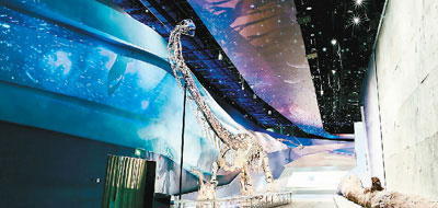 武汉自然博物馆展示的中加马门溪龙化石、硅化木和“龙”足迹化石墙。