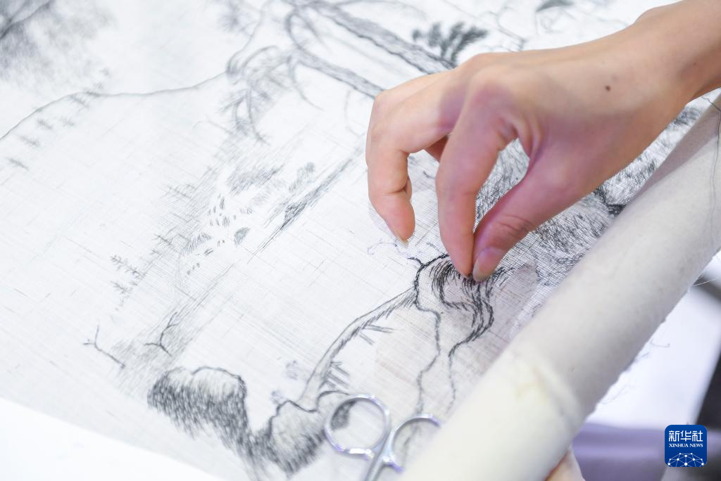 9月23日,参展者在第十七届文博会场馆江西展台展示非遗夏布绣。新华社记者 毛思倩 摄