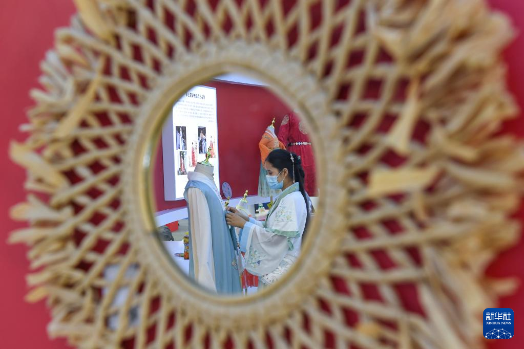 9月23日,在第十七届文博会山东展台,身着汉服的参展人员整理展示的汉服。新华社记者 毛思倩 摄