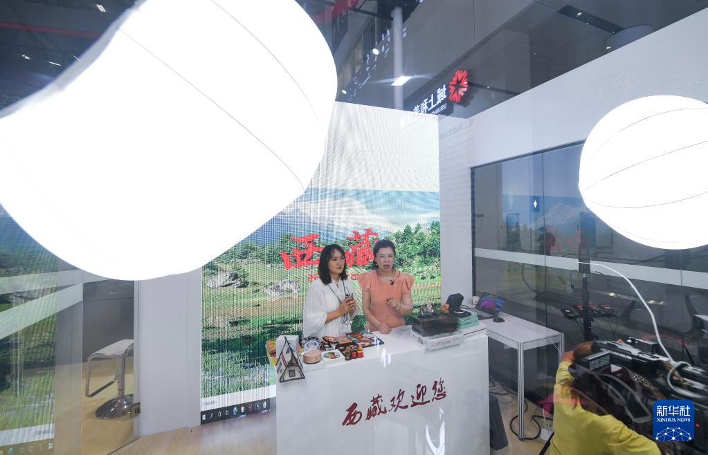 9月23日,参展者在第十七届文博会西藏展台直播。新华社记者 毛思倩 摄