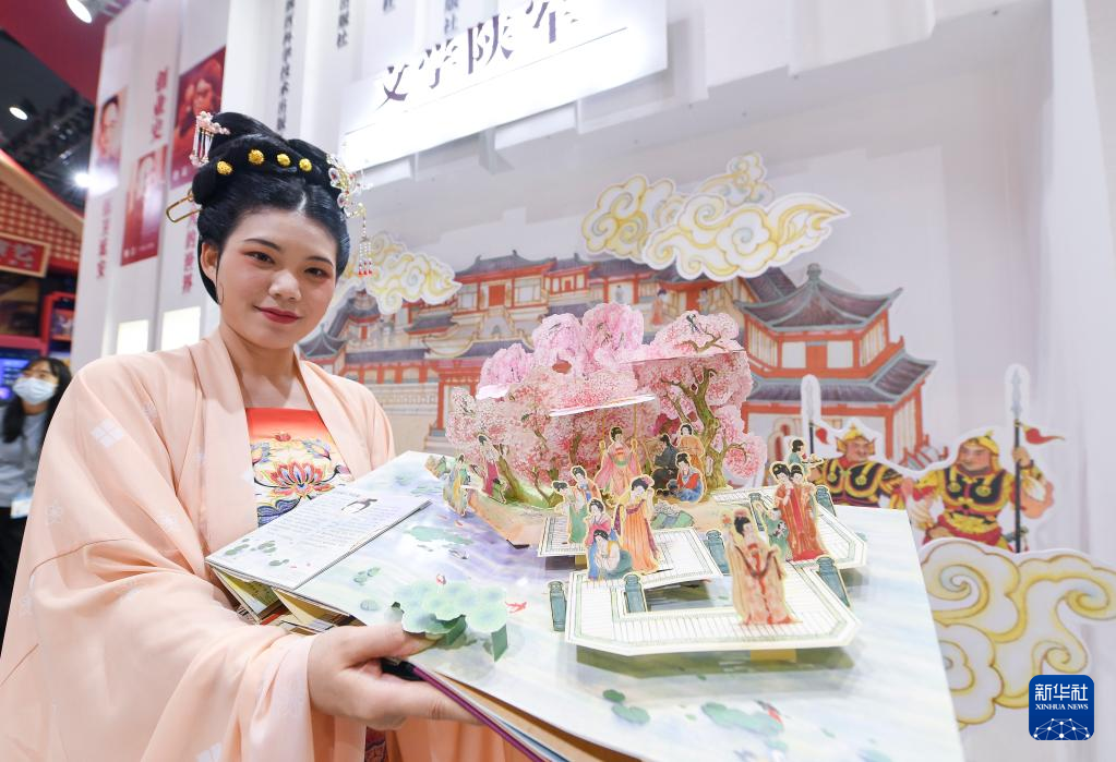 9月23日,盛装的参展者在第十七届文博会陕西展台展示《大唐长安》立体书。新华社记者 毛思倩 摄