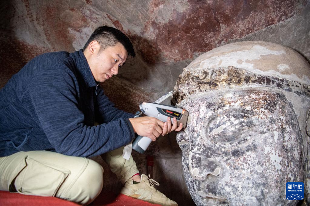 11月12日,修缮工程现场技术员邵明贵在对造像进行表面弹性波检测。新华社记者 唐奕 摄