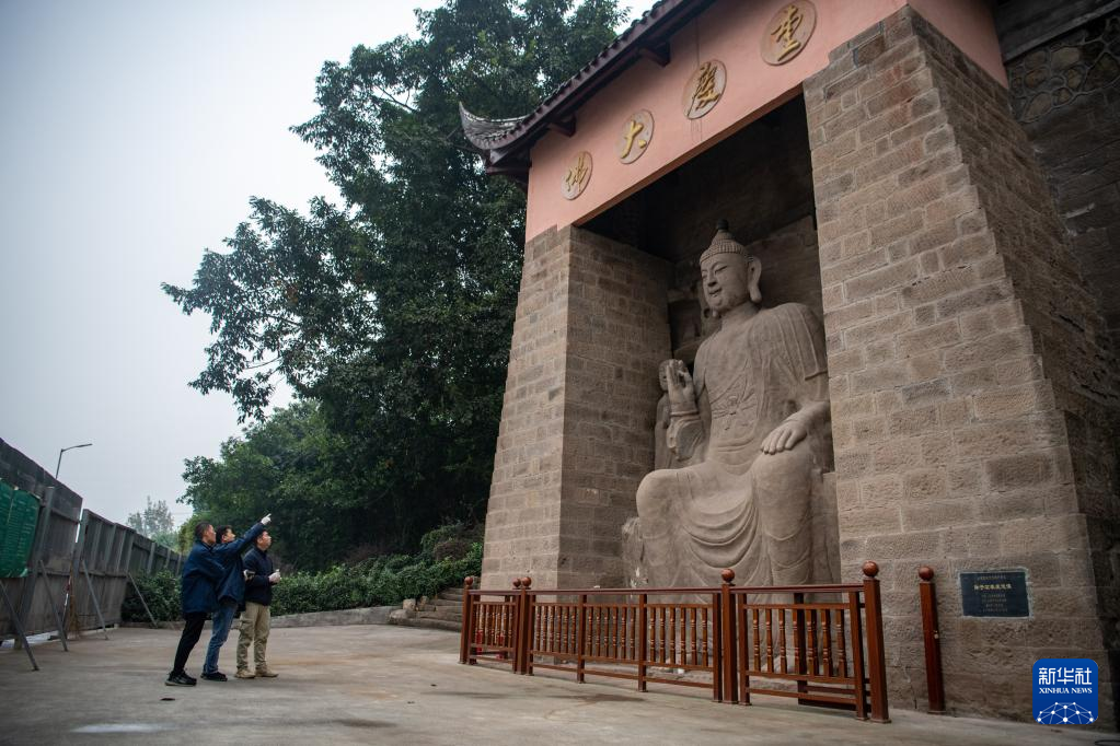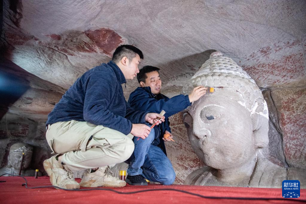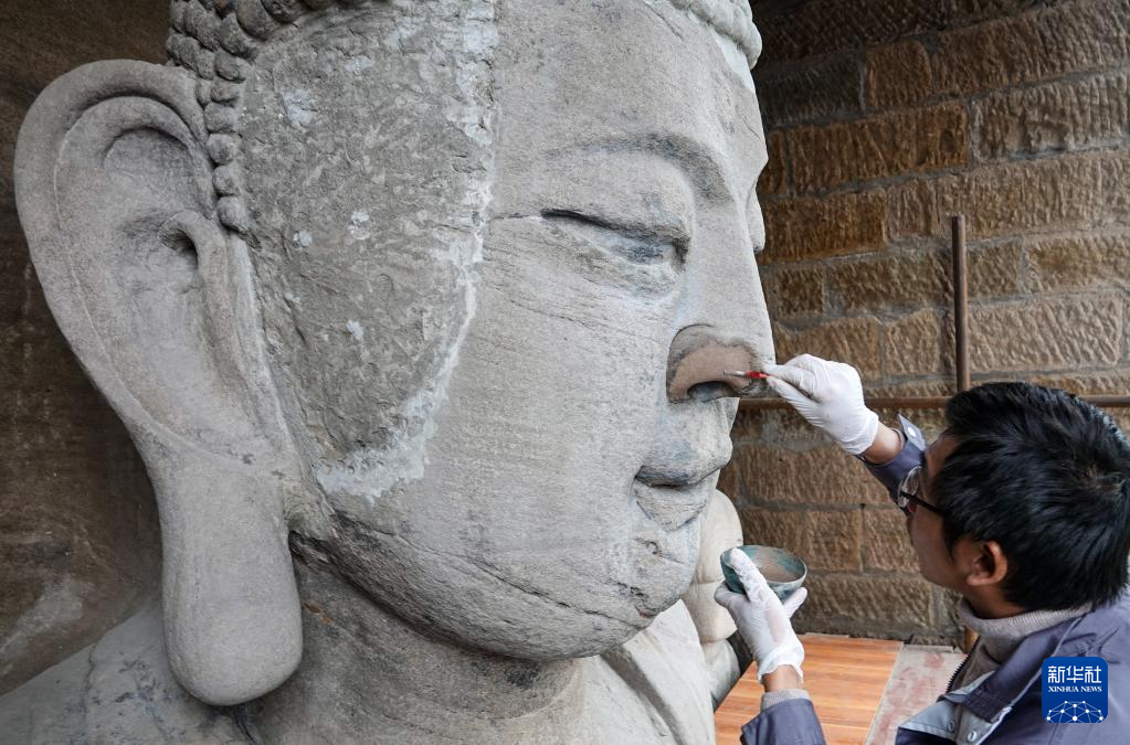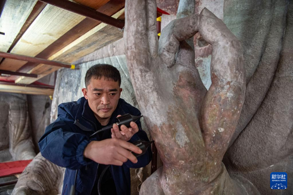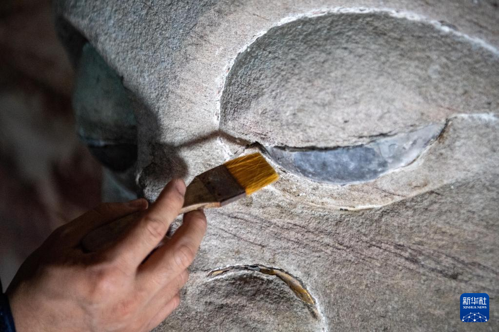 修复技师刘健在对造像残缺部位进行补型(2020年11月3日摄)。位于重庆市南岸区长江岸边的弹子石摩崖造像开凿于元末明初,迄今已有600多年历史。现存的两组摩崖造像造型精美,是三峡库区规模最大的一处石窟造像。 长久以来,受潮湿环境、气候等因素影响,造像不同程度地出现空鼓、开裂、金箔脱落等问题。2016年,该处文物被国家文物局纳入首批“川渝石窟示范项目”,并由中国文化遗产研究院的修缮团队负责实施修缮。 经过团队长期工作,弹子石摩崖造像修缮工程第一期于2021年10月竣工,并通过初步验收。摩崖造像积尘、微生物病害、裂隙、空鼓、残缺及岩体内部盐害等问题得以基本消除。下一步,修缮团队将实施第二阶段修缮工程,开展造像彩绘、金箔层病害治理,佛龛、题刻修复,以及大佛阁修复等工作。 作为川渝石窟保护项目的示范工程,弹子石摩崖造像修缮工程不仅对文物保护及活化利用工作有着重要意义,也为川渝地区石质文物修缮保护提供了宝贵的实践经验。新华社发(中国文化遗产研究院供图)