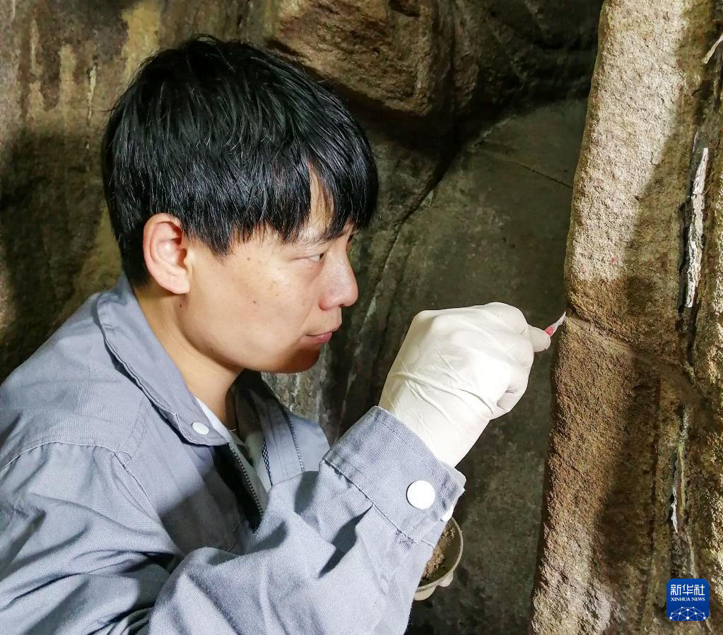 修复技师姚斌在修复造像裂隙(2020年10月26日摄)。新华社发(中国文化遗产研究院供图)