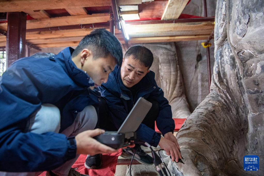11月12日,修缮工程现场技术员寻执政(左)、邵明贵在对造像进行表面弹性波检测。新华社记者 唐奕 摄