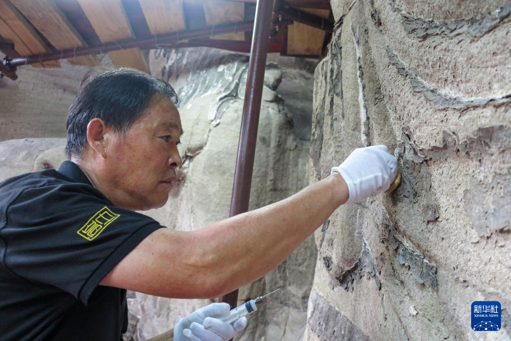 修复技师邵永太在对造像进行加固回贴(2020年8月7日摄)。新华社发(中国文化遗产研究院供图)