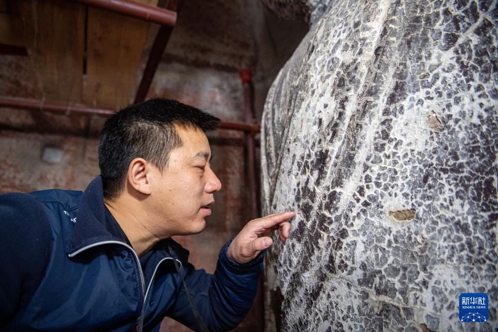 11月12日,修缮工程现场负责人张俊杰在查看造像的大漆层(金箔)龟裂病害。新华社记者 唐奕 摄