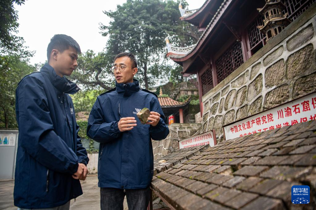 11月12日,修缮工程现场技术员王玉超(右)、寻执政在对修复材料进行稳定性评估。新华社记者 唐奕 摄
