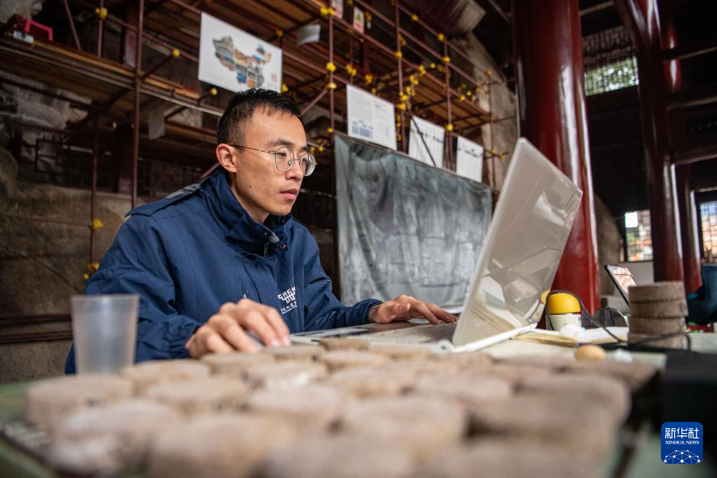 11月12日,修缮工程现场技术员王玉超在整理、分析检测数据。新华社记者 唐奕 摄