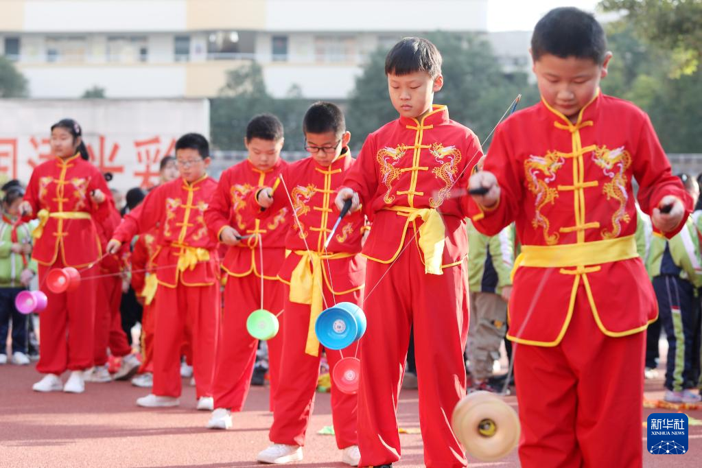 11月15日,淮北市第三实验小学的学生练习抖空竹。秋季开学以来,安徽省淮北市的中小学校利用大课间和课后服务等课外时间,开展形式多样的特色文体社团活动,丰富校园生活,促进学生全面发展和健康成长。新华社发(万善朝 摄)