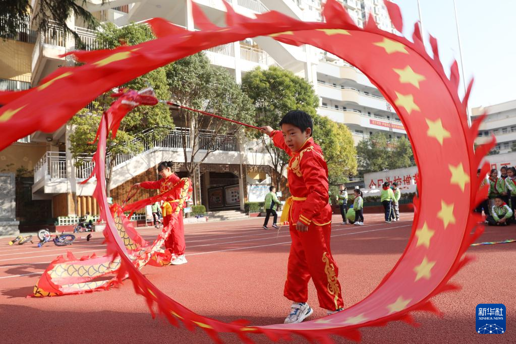 11月15日,淮北市第三实验小学的学生练习舞健身龙。新华社发(万善朝 摄)
