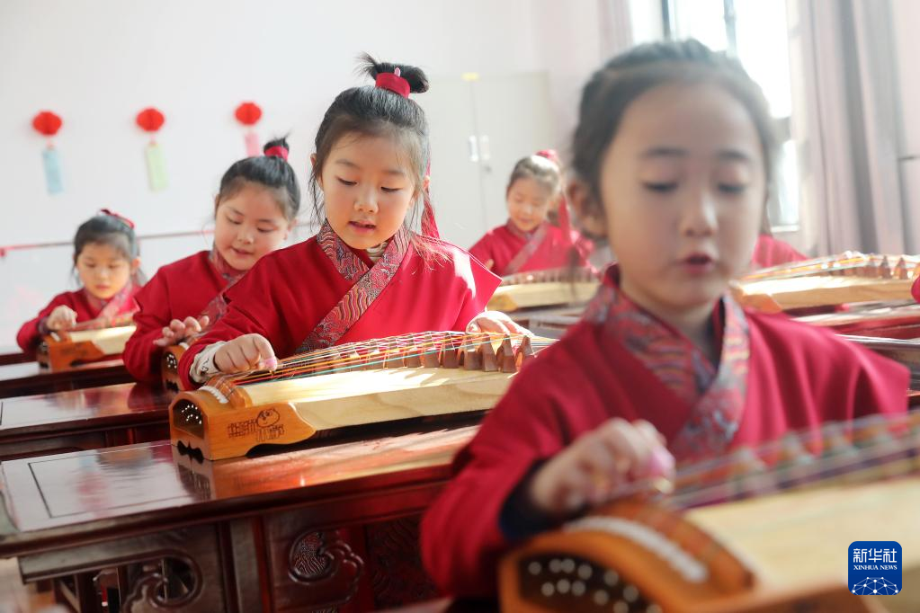 11月15日,淮北市第三实验小学的学生学习古筝。新华社发(万善朝 摄)