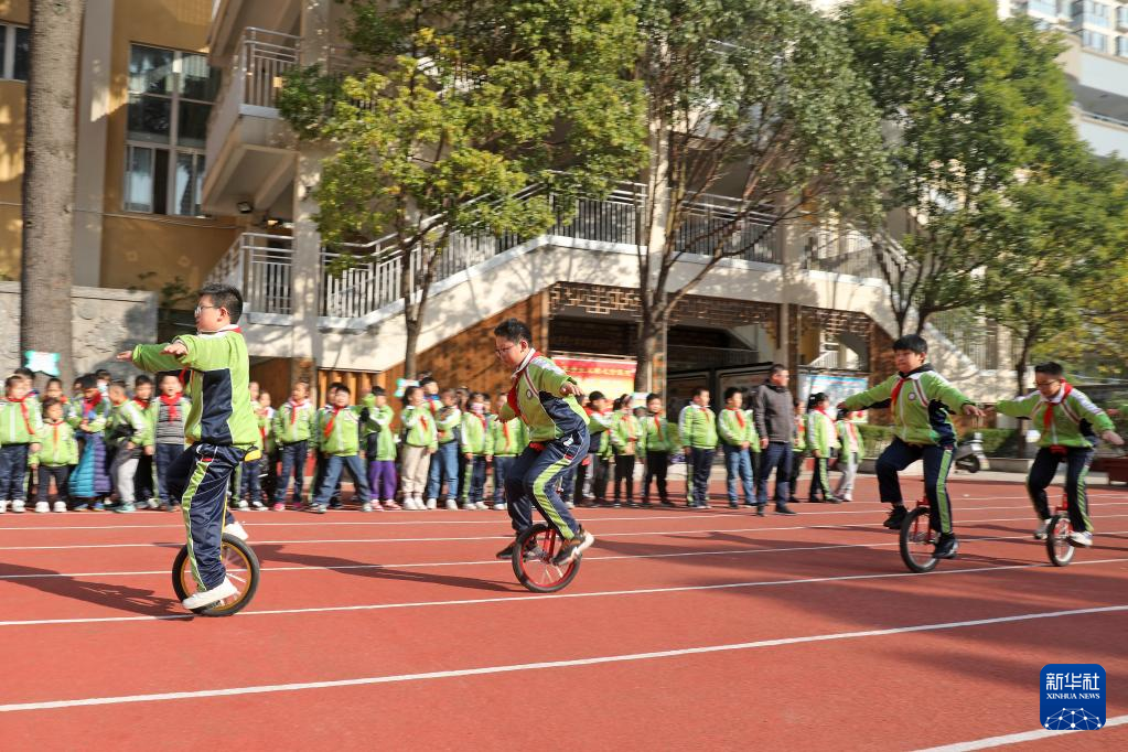11月15日,在淮北市第三实验小学,学生练习骑独轮车。新华社发(万善朝 摄)