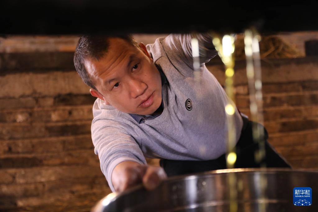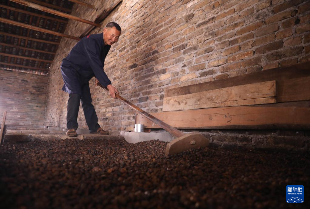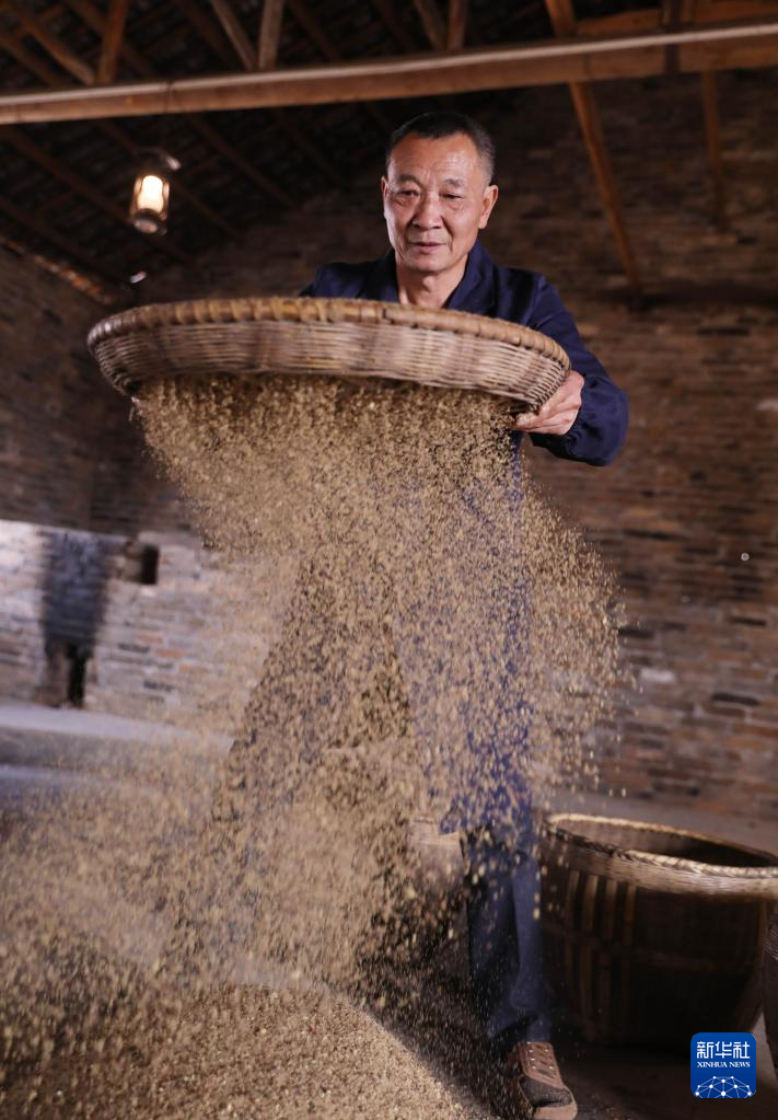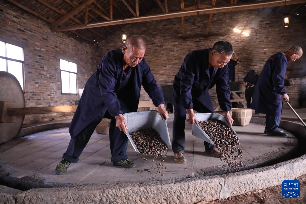 11月29日,在道县祥霖铺镇上渡村,村民在烘烤油茶籽。湖南省永州市道县祥霖铺镇上渡村的榨油坊保留着古老的木制榨油机。当地村民通过烘干茶籽、碾制茶粉、制作茶饼、上膛舂榨和过滤沉淀等传统工序,榨出金黄的茶油,供应各地市场。新华社发(何红福 摄)