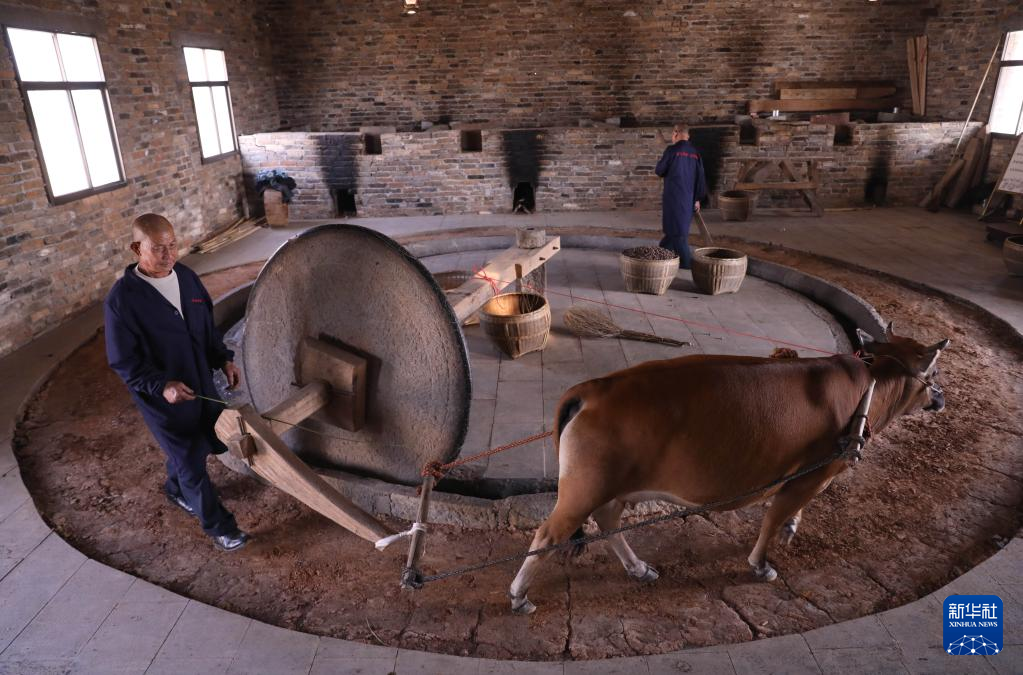 11月29日,在道县祥霖铺镇上渡村,牛拉石碾子碾制茶籽粉。新华社发(何红福 摄)