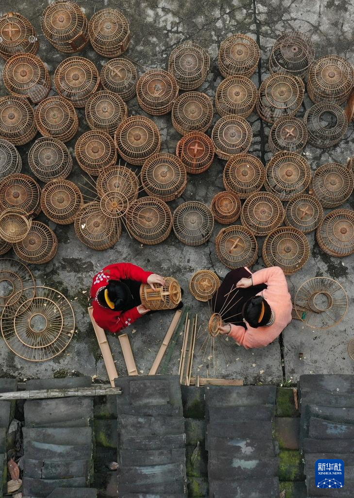 1月9日,在贵州省丹寨县龙泉镇卡拉村,手工艺人制作鸟笼(无人机照片)。