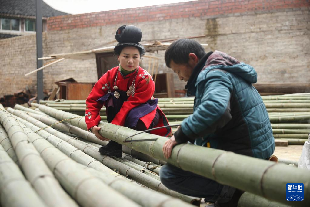 1月9日,在贵州省丹寨县龙泉镇卡拉村,手工艺人挑选用于制作鸟笼的竹子。
