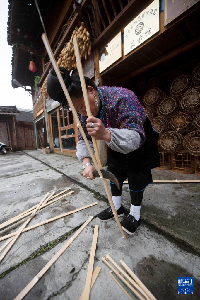 1月9日,在贵州省丹寨县龙泉镇卡拉村,手工艺人加工用于制作鸟笼的竹子。