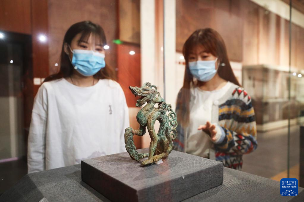 1月10日,观众在欣赏张家口市崇礼区太子城遗址发现的铜坐龙。