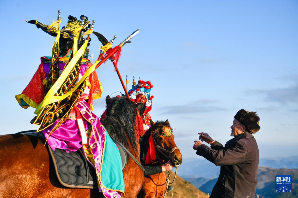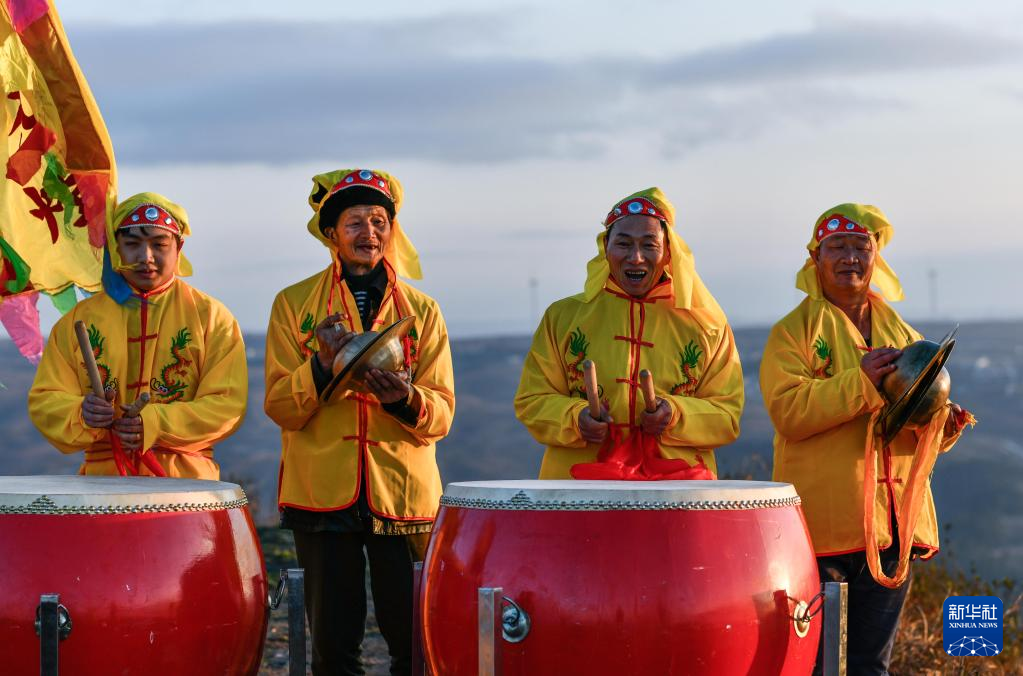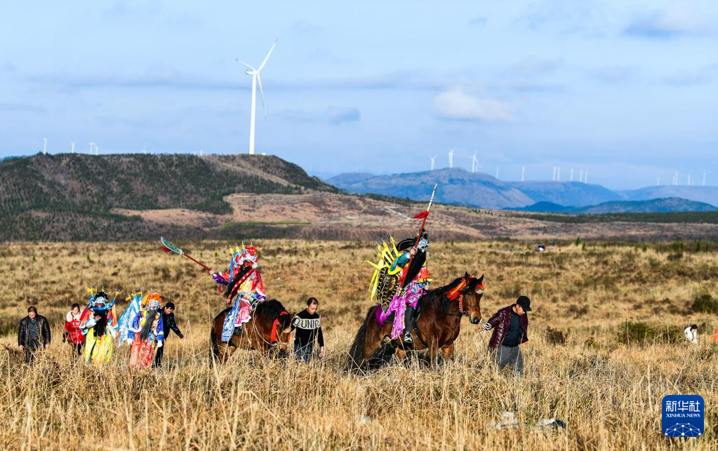 2月7日,龙里太平花灯戏的成员前往村子附近的山顶练习花灯戏。 新华社记者 杨文斌 摄