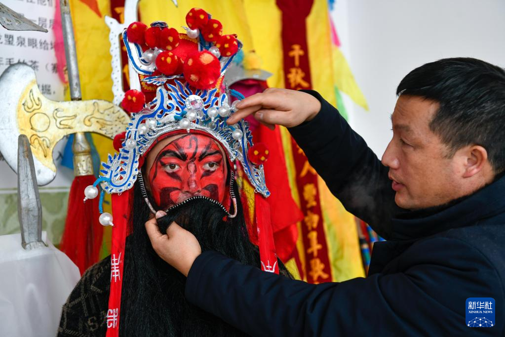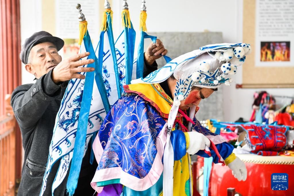 2月6日,龙里太平花灯戏艺人赵应明(左)在给戏班成员整理行头。 新华社记者 杨文斌 摄