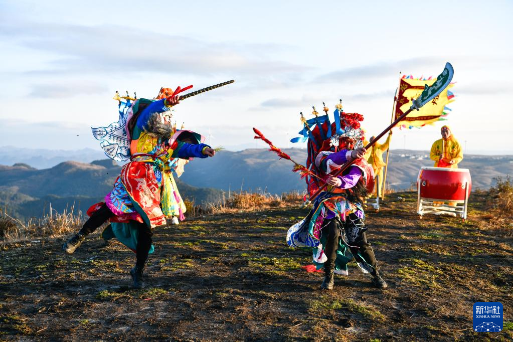2月7日,龙里县龙山镇的年轻人在村子附近的山顶练习龙里太平花灯戏。 新华社记者 杨文斌 摄