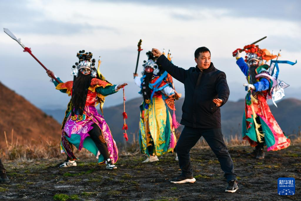 2月7日,龙里太平花灯戏艺人刘江(前)在村子附近的山顶上指导年轻人练习花灯戏。 新华社记者 杨文斌 摄