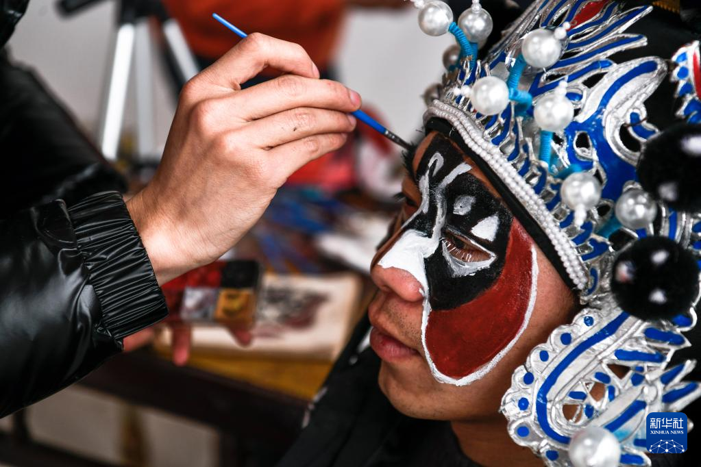 2月6日,龙里太平花灯戏的成员在表演前化装。 新华社记者 杨文斌 摄