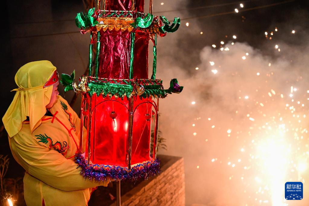 2月7日夜,龙里县龙山镇的村民扛着花灯参加“亮灯巡寨”活动。 新华社记者 杨文斌 摄