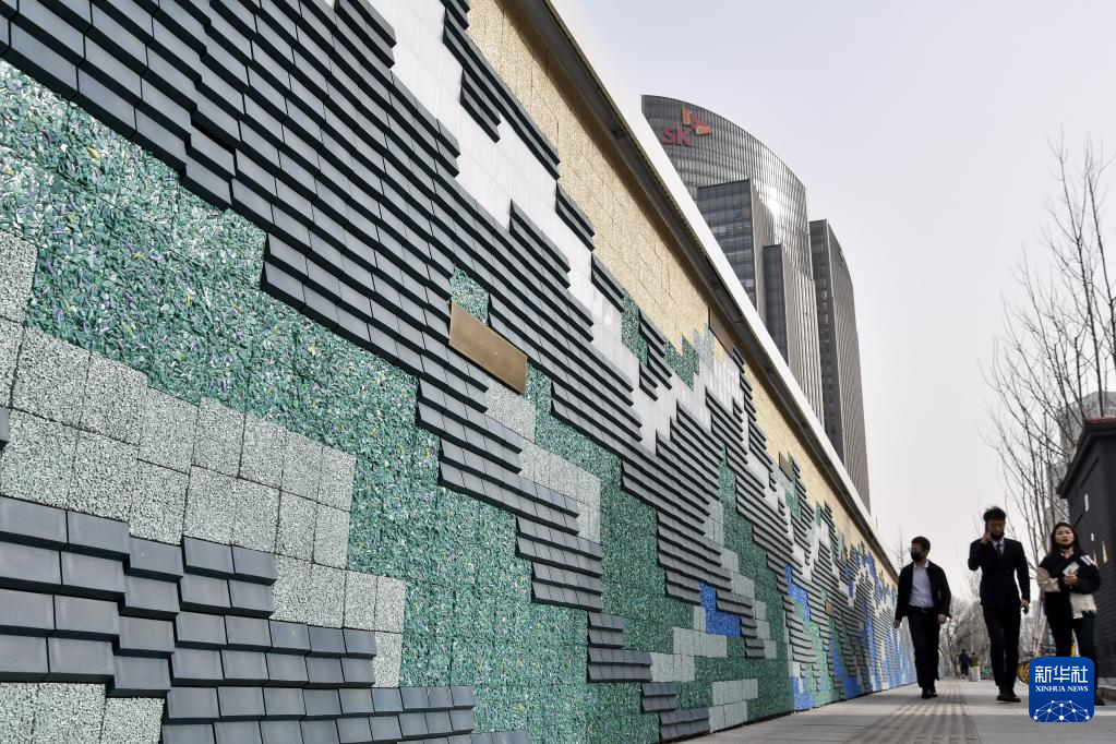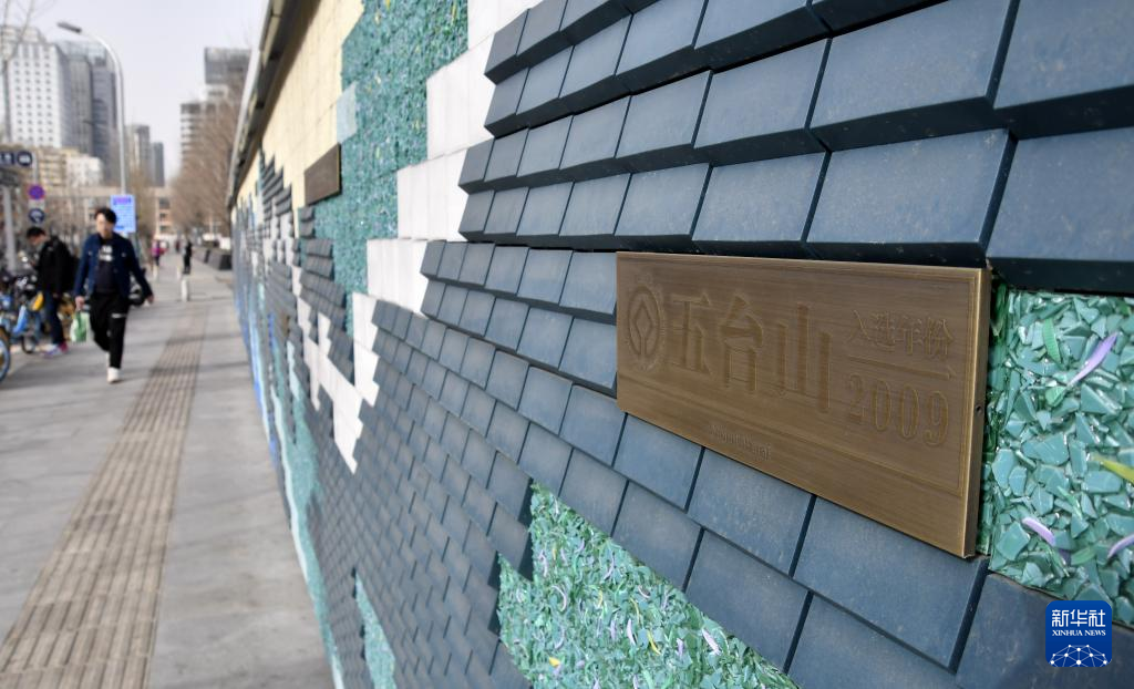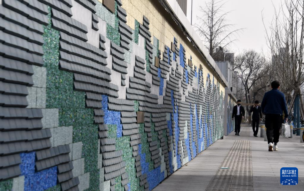 日前,一堵百米长的《青山万里图》亮相北京金桐路边。长卷由近3万块利用废旧塑料瓶、瓶盖、家电外壳、高速公路反光牌等回收材料粉碎重新注塑成型的环保砖拼接而成。