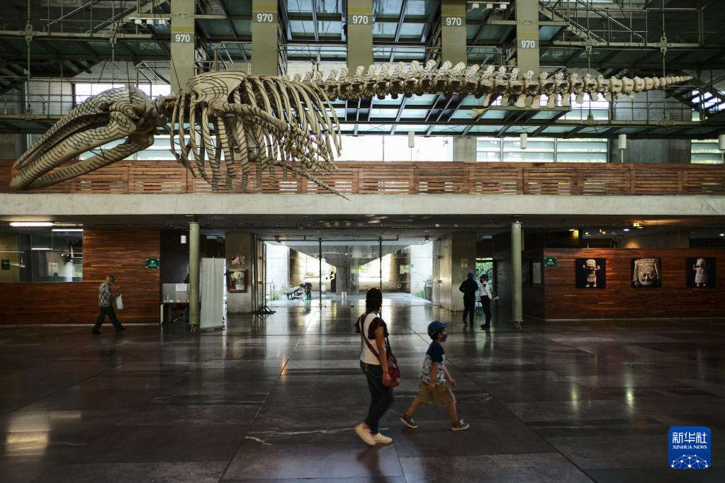 这是4月18日在墨西哥首都墨西哥城拍摄的巴斯孔塞洛斯图书馆内的灰鲸骨骼。