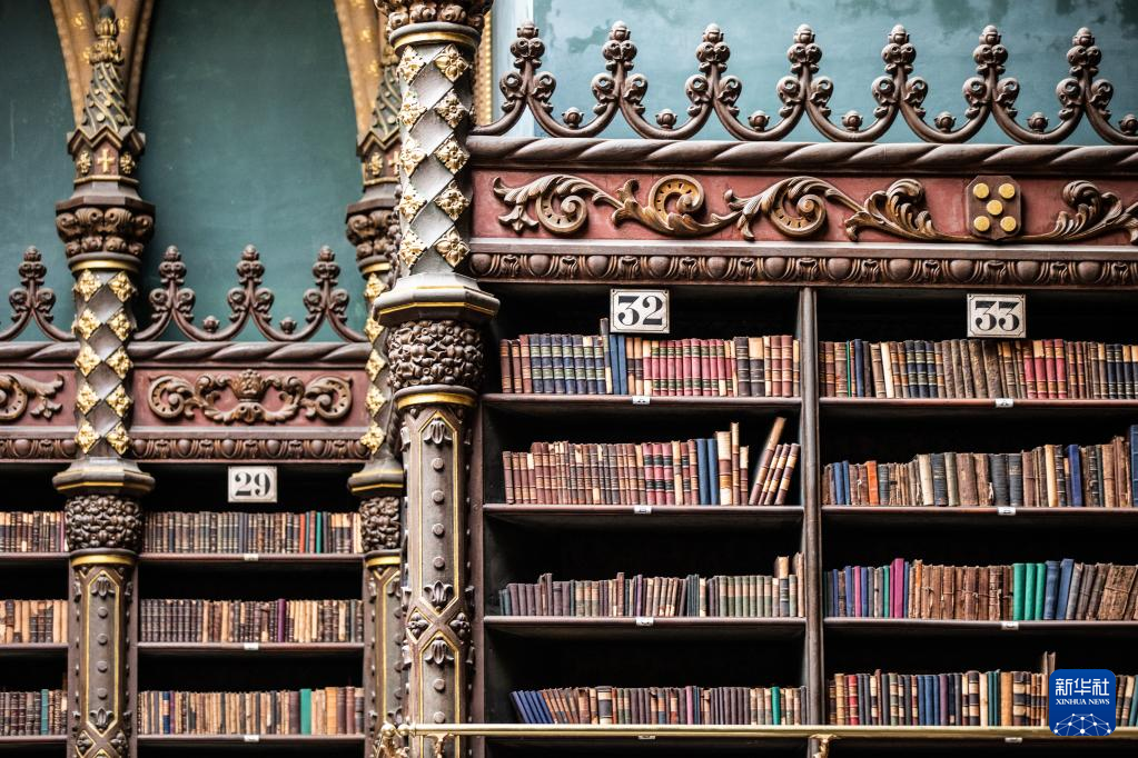 这是4月19日在巴西里约热内卢拍摄的皇家葡文图书馆书架。