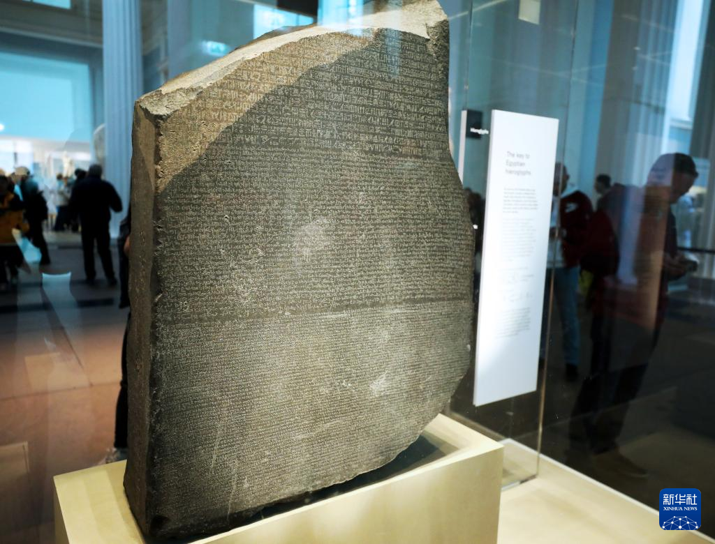 这是5月11日在英国伦敦大英博物馆拍摄的藏品罗塞塔石碑。罗塞塔石碑上刻有三种铭文,文字学家凭借这些铭文破译了古埃及象形文字的秘密。
