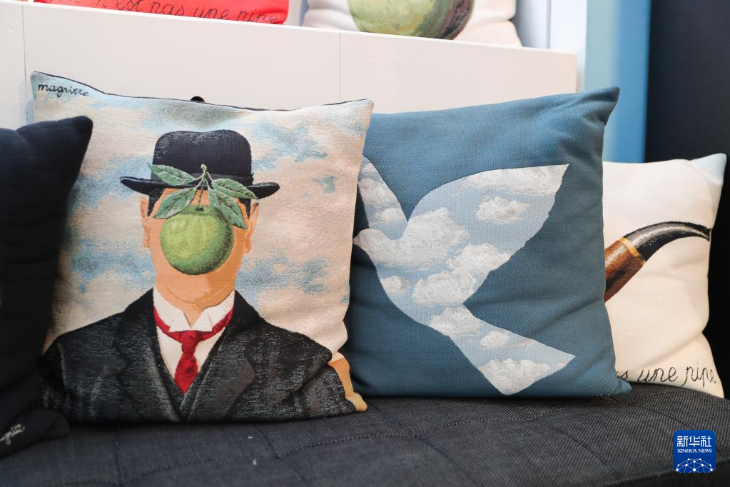 这是5月15日在比利时布鲁塞尔的马格里特博物馆的纪念品商店拍摄的文创产品——以勒内·马格里特的绘画作品为灵感制作的抱枕。