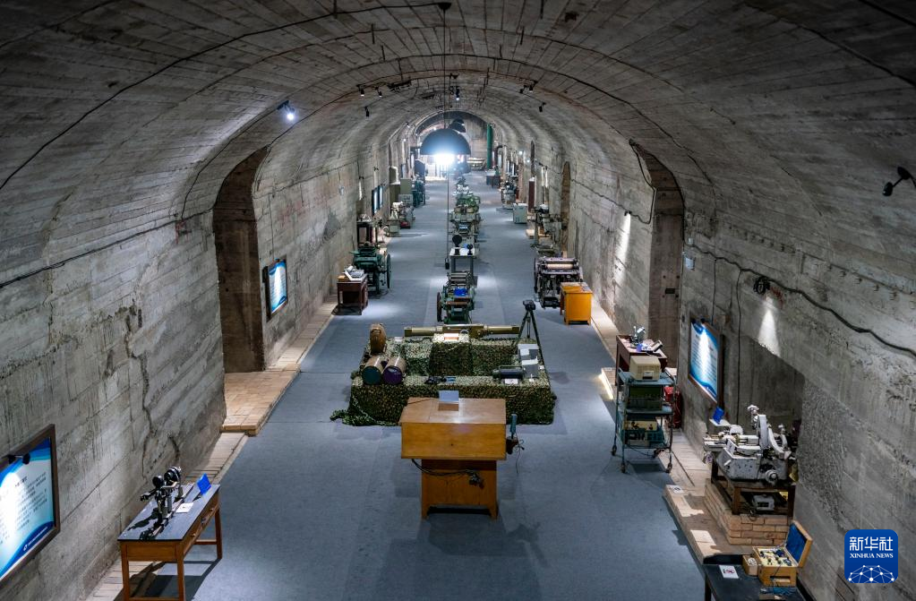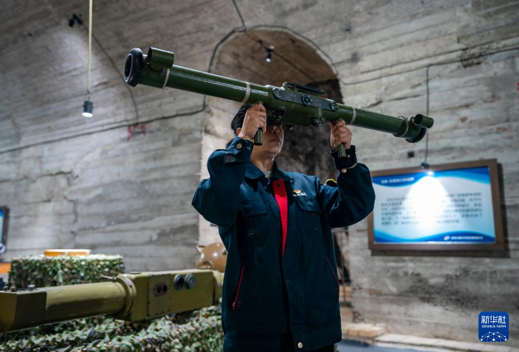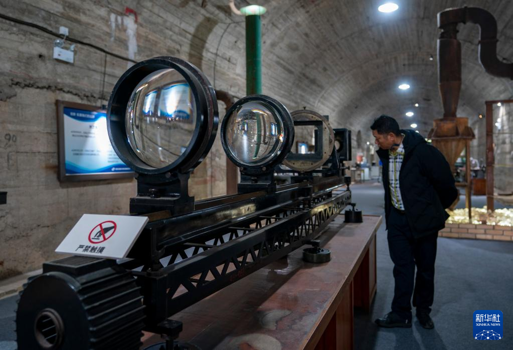 5月16日,一名工作人员在中国光学历史博物馆内展示对空测距机使用方法。