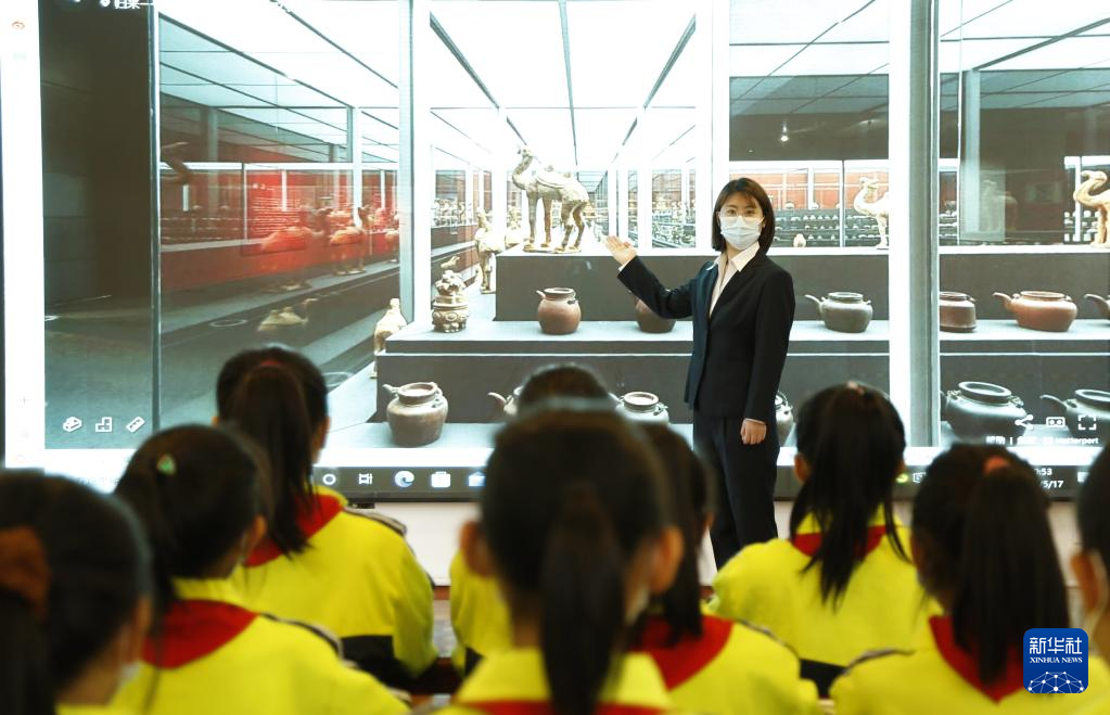 5月17日,河北省邢台市东大街小学教师带领学生在线上参观中国国家博物馆数字展厅。