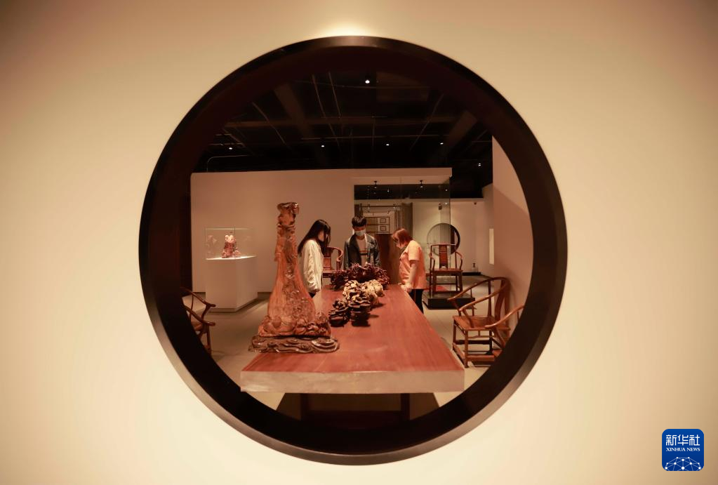 5月17日,人们在位于河北省遵化市新店子镇的一家木雕艺术博物馆观看藏品。