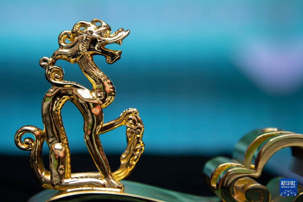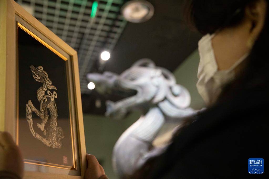 黑龙江省博物馆内展示的以铜坐龙为原型设计的云起龙骧案饰(5月16日摄)。